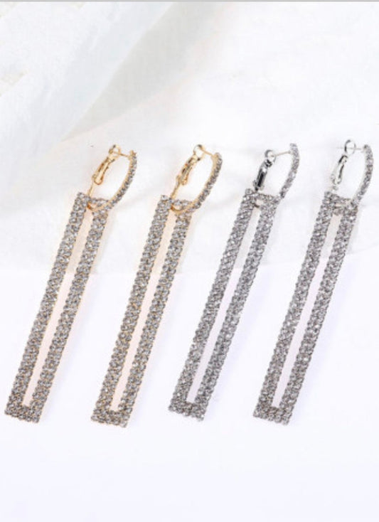 La Belle Fantastique Silvery Clip-on Long Drop Rectangle Rhinestone Earrings,Bar Earrings, Solid Brass Earrings, Geometric Earrings
